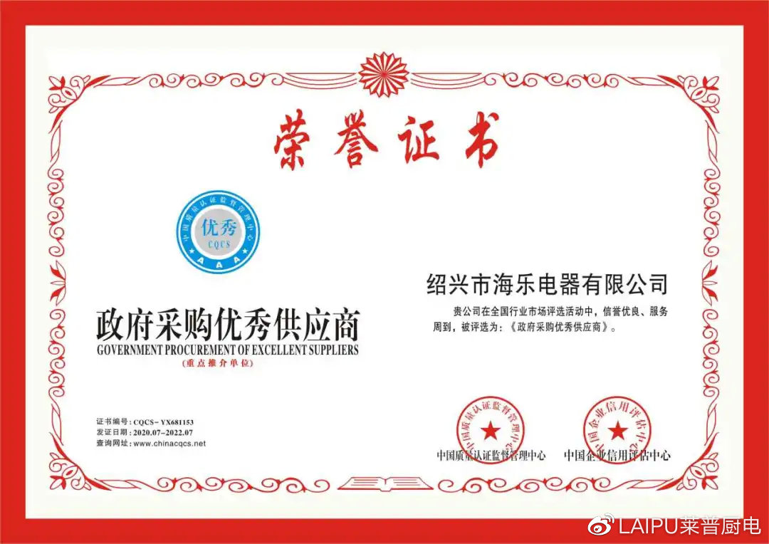 7月16日海樂電器有限公司(蕾丝视频污下载廚電)榮獲“中國3.15誠信企業、政府采購優秀供應商、全國產品質量服務無投訴企業”三項榮譽證書以及“國際標準產品標誌證書”、“中國節能產品認證證書”。